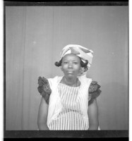 - A woman wearing a dress and head wrap sitting face-forward in the studio.